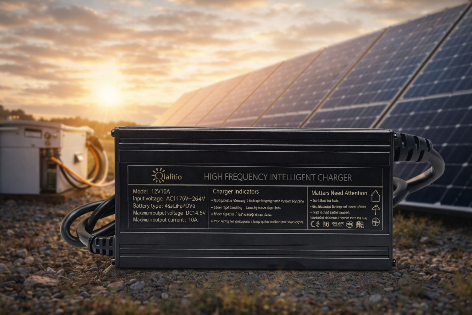 Chargeur intelligent LiFePO4 12V 10A haute efficacité 91,5%. Idéal pour solaire, camping-car, bateau et stockage d’énergie. Garantie 5 ans.