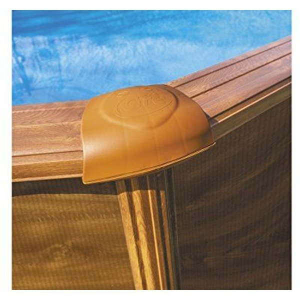 - C'est une piscine ovale avec une paroi en acier décorée en bois avec un système de poutres.