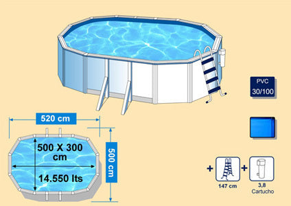 Piscine ovale amovible en acier inoxydable de 500 x 300 cm et 120 cm de profondeur.
