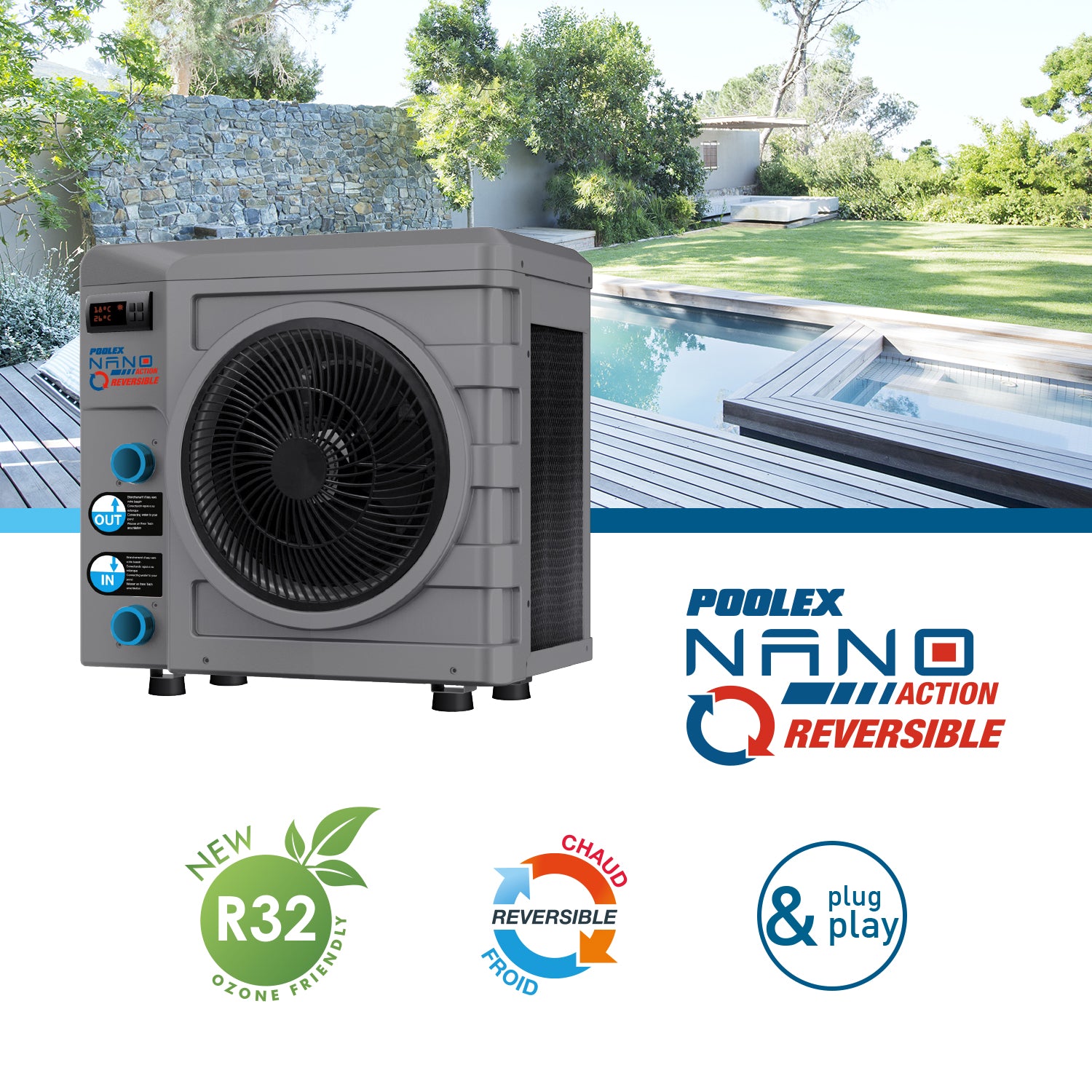 Spécialement conçue pour vous faciliter la vie, la Nano Action 2020 5KW réversible est déjà équipée de ses raccords 32/38mm pour un raccordement en quelques secondes à tous les systèmes de filtration classiques.